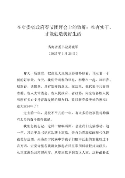 领导讲话:20250126在省委省政府春节团拜会上的致辞:唯有实干,才能创造美好生活——青海省委书记吴晓军