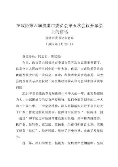 / 领导讲话:20250120在政协第六届贵港市委员会第五次会议开幕会上的讲话——贵港市委书记朱会东