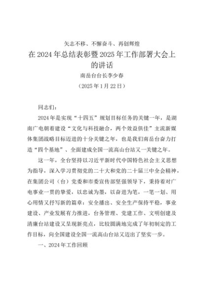 / 领导讲话:20250122在2024年总结表彰暨2025年工作部署大会上的讲话——南岳台台长李少春