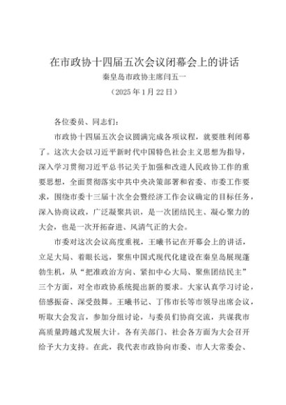 / 领导讲话:20250122在市政协十四届五次会议闭幕会上的讲话——秦皇岛市政协主席闫五一