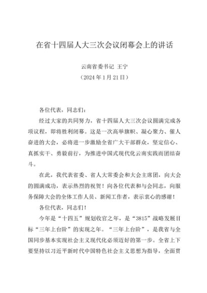 / 领导讲话:20250121在省十四届人大三次会议闭幕会上的讲话——云南省委书记 王宁