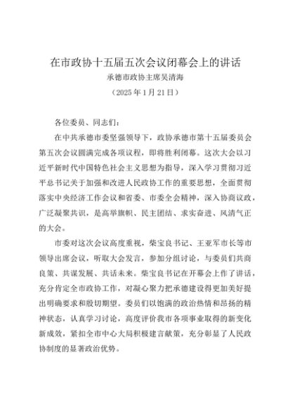 / 领导讲话:20250121在市政协十五届五次会议闭幕会上的讲话——承德市政协主席吴清海