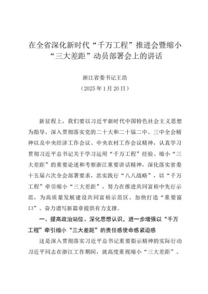 / 领导讲话:20250120在全省深化新时代“千万工程”推进会暨缩小“三大差距”动员部署会上的讲话——浙江省委书记王浩