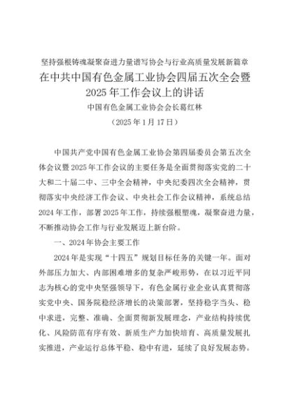 领导讲话:20250117在中共中国有色金属工业协会四届五次全会暨2025年工作会议上的讲话——中国有色金属工业协会会长葛红林