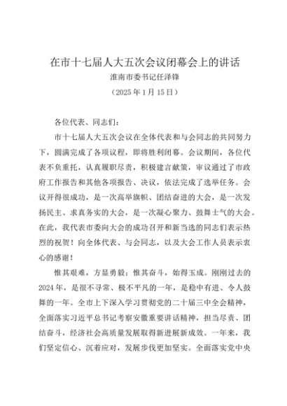 / 领导讲话:20250115在市十七届人大五次会议闭幕会上的讲话——淮南市委书记任泽锋