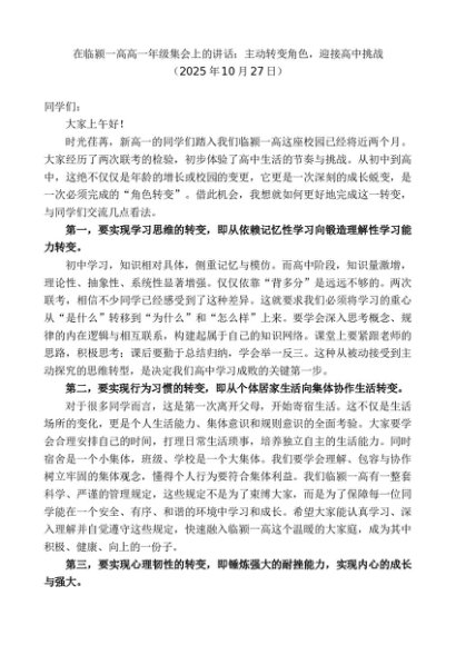 / 领导讲话:20251030在临颍一高高一年级集会上的讲话:主动转变角色,迎接高中挑战
