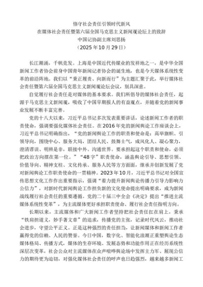 / 领导讲话:20251030在媒体社会责任暨第六届全国马克思主义新闻观论坛上的致辞:恪守社会责任引领时代新风