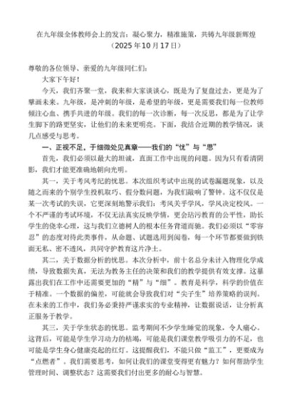/ 领导讲话:20251030在九年级全体教师会上的发言:凝心聚力,精准施策,共铸九年级新辉煌