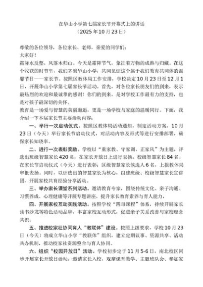 / 领导讲话:20251030在华山小学第七届家长节开幕式上的讲话