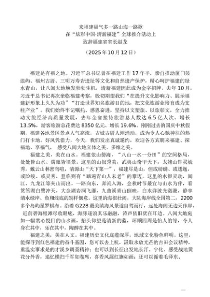 / 领导讲话:20251012在“炫彩中国·清新福建”全球推介活动上致辞——福建省省长赵龙