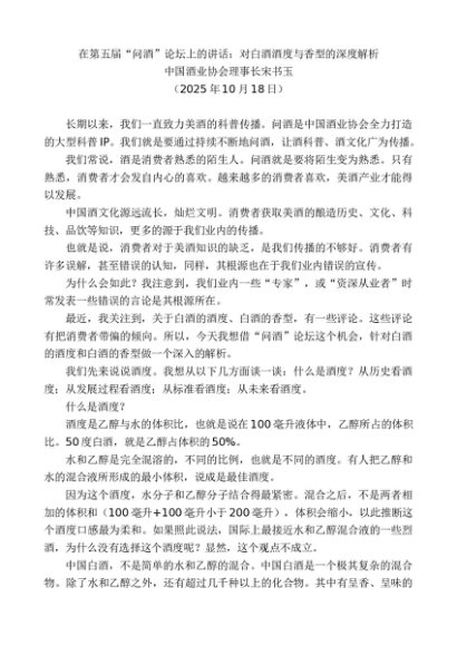 / 领导讲话:20251030中国酒业协会理事长宋书玉:在第五届“问酒”论坛上的讲话:对白酒酒度与香型的深度解析