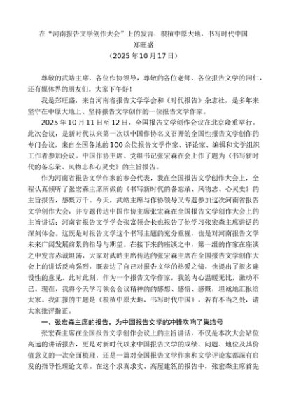 领导讲话:20251030郑旺盛:在“河南报告文学创作大会”上的发言:根植中原大地,书写时代中国
