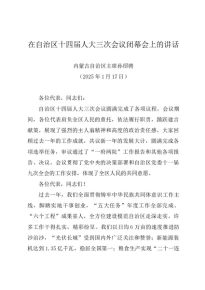 领导讲话:20250117在自治区十四届人大三次会议闭幕会上的讲话——内蒙古自治区主席孙绍骋