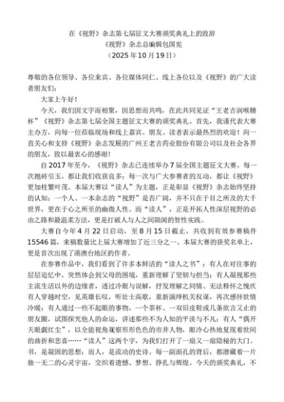 领导讲话:20251030《视野》杂志总编辑包国宪:在《视野》杂志第七届征文大赛颁奖典礼上的致辞