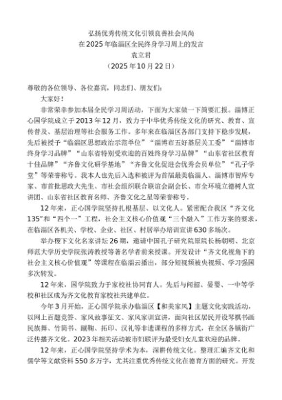 / 领导讲话:20251030在2025年临淄区全民终身学习周上的发言:弘扬优秀传统文化引领良善社会风尚