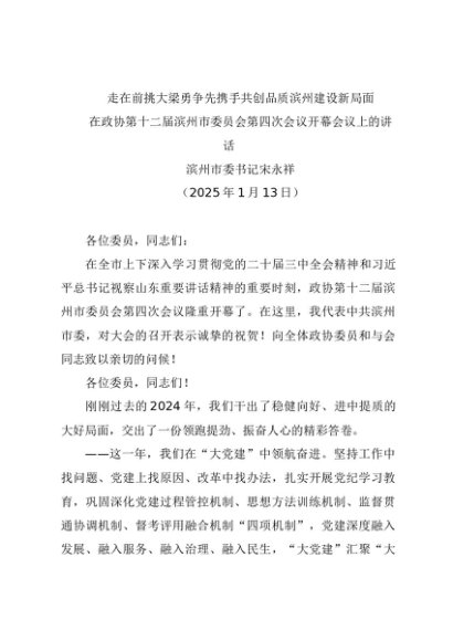 / 领导讲话:20250113在政协第十二届滨州市委员会第四次会议开幕会议上的讲话——滨州市委书记宋永祥