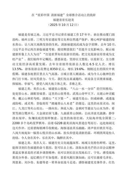 领导讲话:20251030福建省省长赵龙:在“炫彩中国清新福建”全球推介活动上的致辞