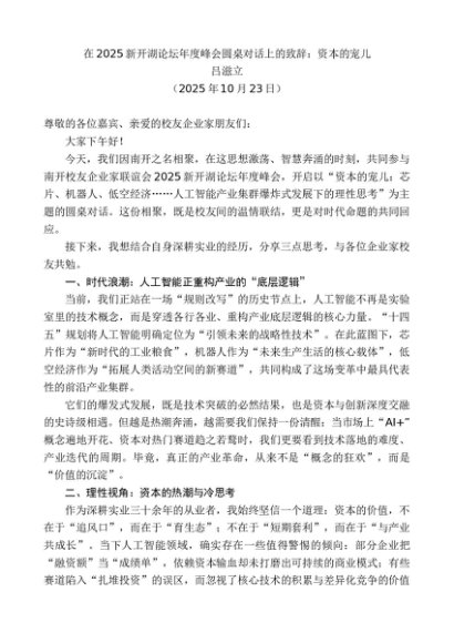 领导讲话:20251030吕滋立:在2025新开湖论坛年度峰会圆桌对话上的致辞:资本的宠儿