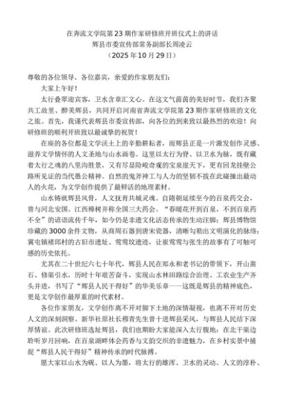 / 领导讲话:20251030辉县市委宣传部常务副部长周凌云:在奔流文学院第23期作家研修班开班仪式上的讲话