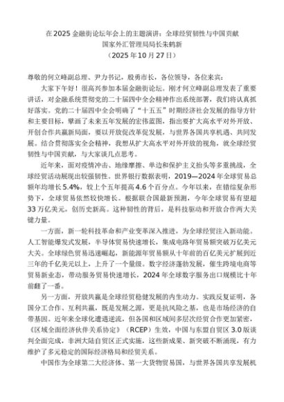 / 领导讲话:20251030国家外汇管理局局长朱鹤新:在2025金融街论坛年会上的主题演讲:全球经贸韧性与中国贡献