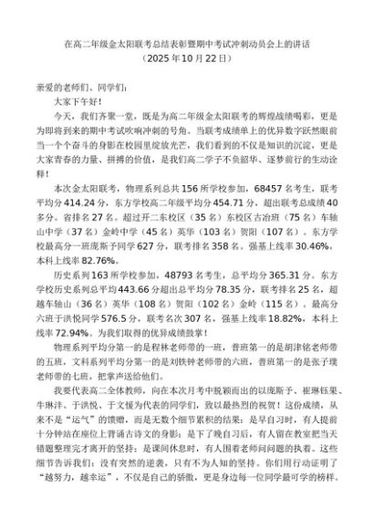 / 领导讲话:20251030在高二年级金太阳联考总结表彰暨期中考试冲刺动员会上的讲话