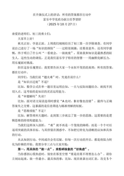 / 领导讲话:20251030富乐中学党政办副主任李望舒:在升旗仪式上的讲话:所有的答案都在行动中