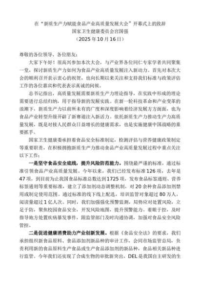 / 领导讲话:20251030国家卫生健康委员会宫国强:在“新质生产力赋能食品产业高质量发展大会”开幕式上的致辞