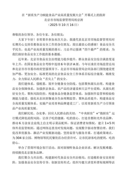 / 领导讲话:20251030北京市市场监督管理局祝京涛:在“新质生产力赋能食品产业高质量发展大会”开幕式上的致辞