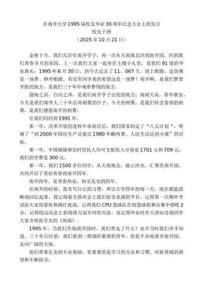 / 领导讲话:20251030校友于洲:在南开大学1995届校友毕业30周年纪念大会上的发言
