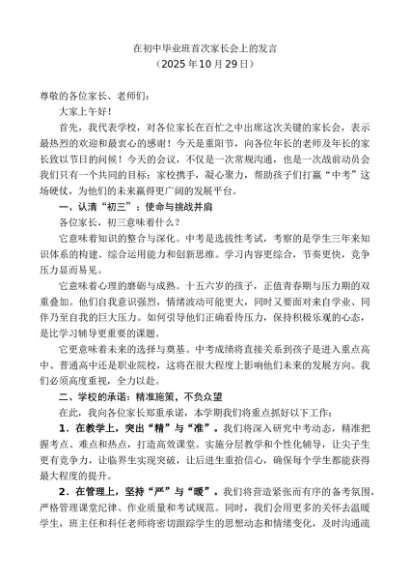 / 领导讲话:20251030在初中毕业班首次家长会上的发言