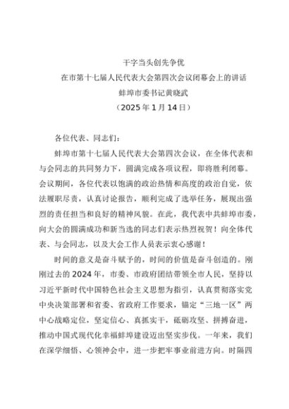 / 领导讲话:20250114在市第十七届人民代表大会第四次会议闭幕会上的讲话——蚌埠市委书记黄晓武