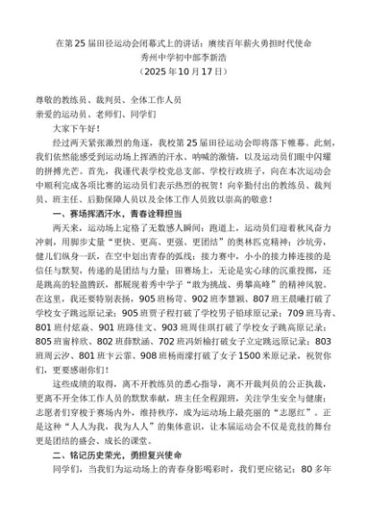领导讲话:20251030秀州中学初中部李新浩:在第25届田径运动会闭幕式上的讲话:赓续百年薪火勇担时代使命