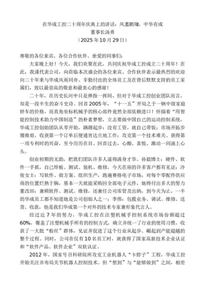 / 领导讲话:20251030董事长汤勇:在华成工控二十周年庆典上的讲话:凤翥鹏翔,中华有成