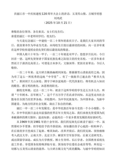 领导讲话:20251030刘鸿武:在丽江市一中庆祝建校120周年大会上的讲话:玉龙雪山情,古城学府恩