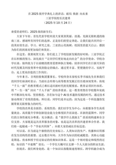 领导讲话:20251030三亚学院校长沈建勇:在2025级开学典礼上的讲话:破局焕新向未来