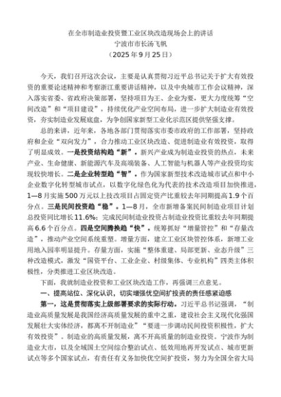 / 领导讲话:20251030宁波市市长汤飞帆:在全市制造业投资暨工业区块改造现场会上的讲话