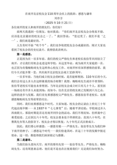 领导讲话:20251030刘亦方:在南开北京校友会110周年会庆上的致辞:感恩与谦卑