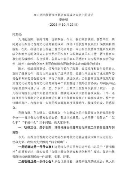 / 领导讲话:20251030李俊明:在山西当代晋商文化研究院成立大会上的讲话