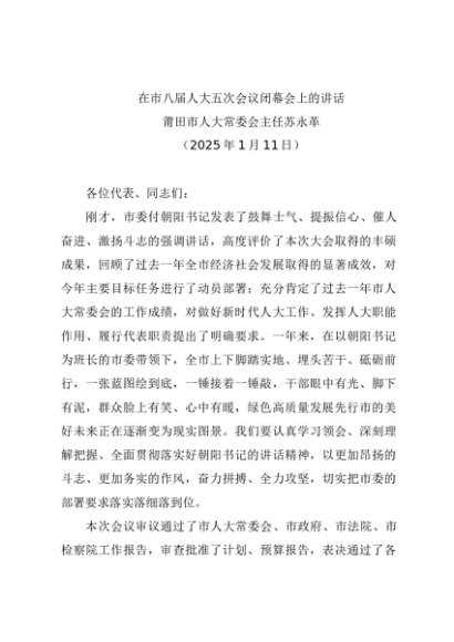 领导讲话:20250111在市八届人大五次会议闭幕会上的讲话——莆田市人大常委会主任苏永革