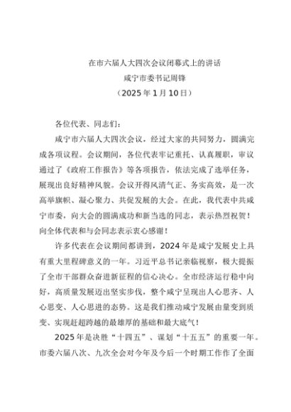 / 领导讲话:20250110在市六届人大四次会议闭幕式上的讲话——咸宁市委书记周锋