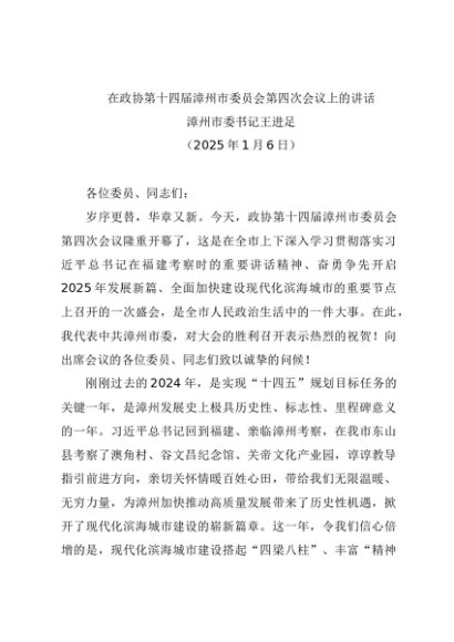/ 领导讲话:20250106在政协第十四届漳州市委员会第四次会议上的讲话——漳州市委书记王进足
