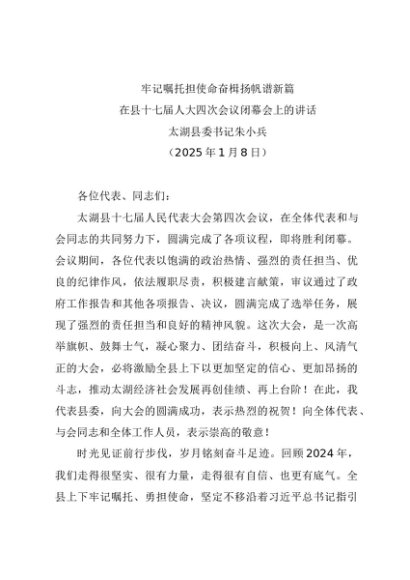/ 领导讲话:20250108在县十七届人大四次会议闭幕会上的讲话——太湖县委书记朱小兵