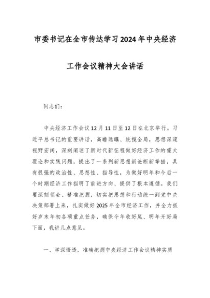 / 领导讲话:20241220市委书记在全市传达学习2024年中央经济工作会议精神大会讲话