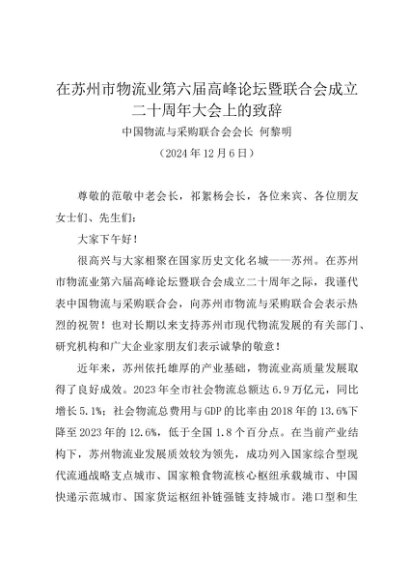 领导讲话:20241206在苏州市物流业第六届高峰论坛暨联合会成立二十周年大会上的致辞——中国物流与采购联合会会长 何黎明