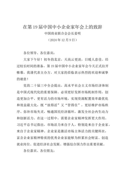 / 领导讲话:20241209在第19届中国中小企业家年会上的致辞——中国商业联合会会长姜明