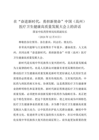 领导讲话:20241205在“奋进新时代,勇担新使命”中国(高州)医疗卫生健康高质量发展大会上的讲话——国家中医药管理局局原副局长