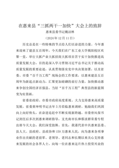 / 领导讲话:20241211在惠来县“三抓两干一加快”大会上的致辞——惠来县委书记魏洁林