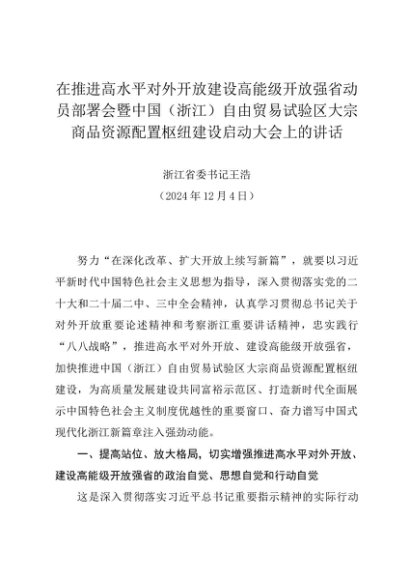 领导讲话:20241204在推进高水平对外开放建设高能级开放强省动员部署会暨中国(浙江)自由贸易试验区大宗商品资源配置枢纽建设启动大会上的讲话——浙江省委书记王浩