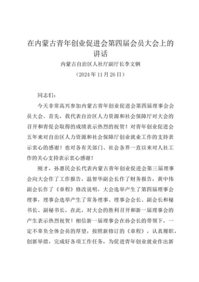 / 领导讲话:20241126在内蒙古青年创业促进会第四届会员大会上的讲话——内蒙古自治区人社厅副厅长李文钢