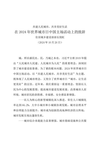 / 领导讲话:20241126在2024年世界城市日中国主场活动上的致辞——住房城乡建设部部长倪虹